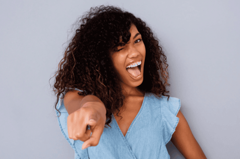 Photo d’une jeune femme rayonnante pointant du doigt, exprimant la joie, l’enthousiasme et l’énergie communicative d’un message tourné vers les femmes.